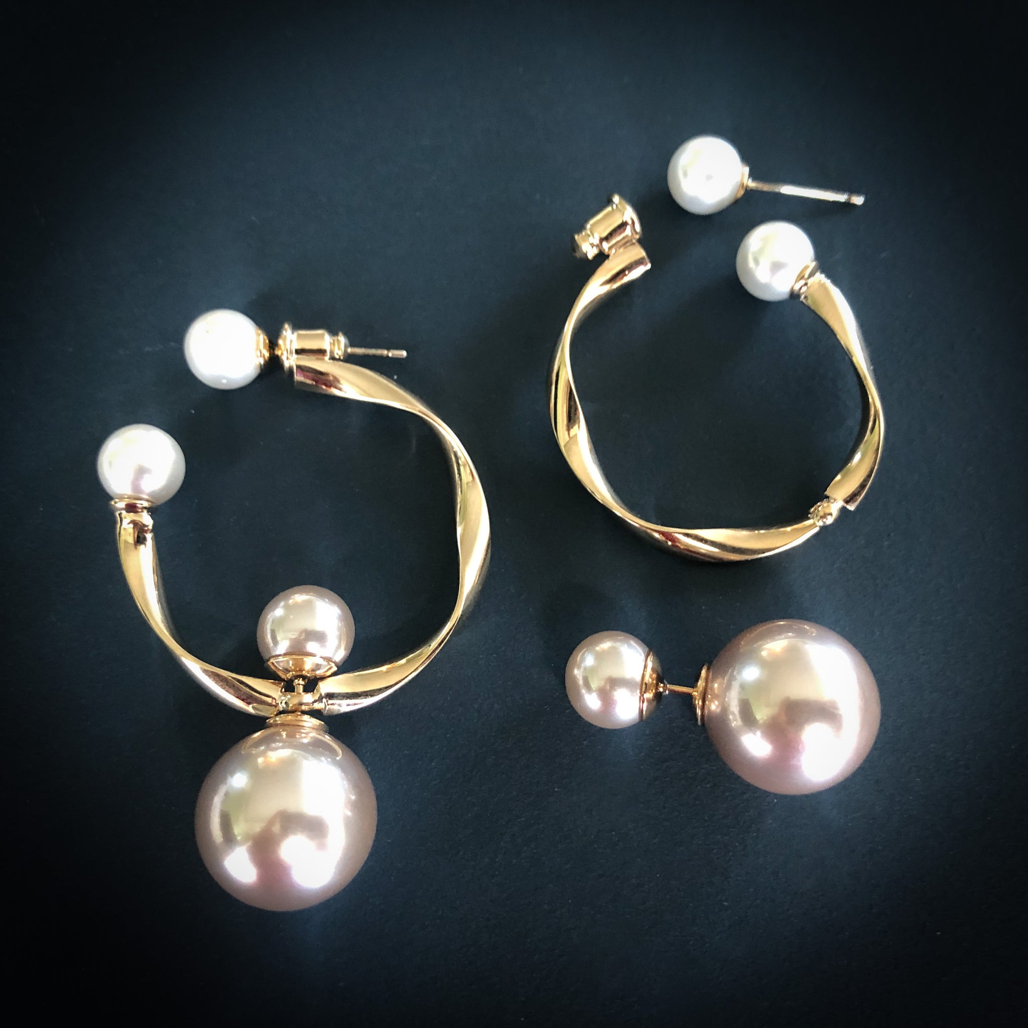 The transformer hoops feature a deconstructed design that can be worn as simple white pearl stud, Coffee colored pearl back studs or hoops. This one and all design is perfect for traveling as well as everyday wear.
