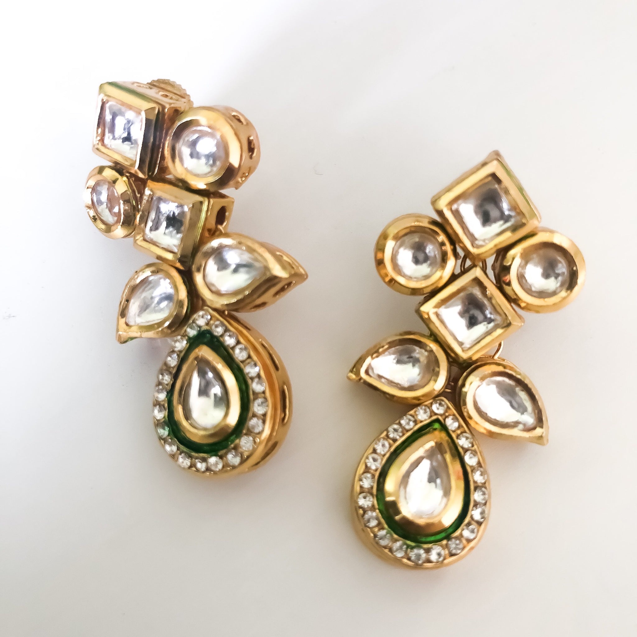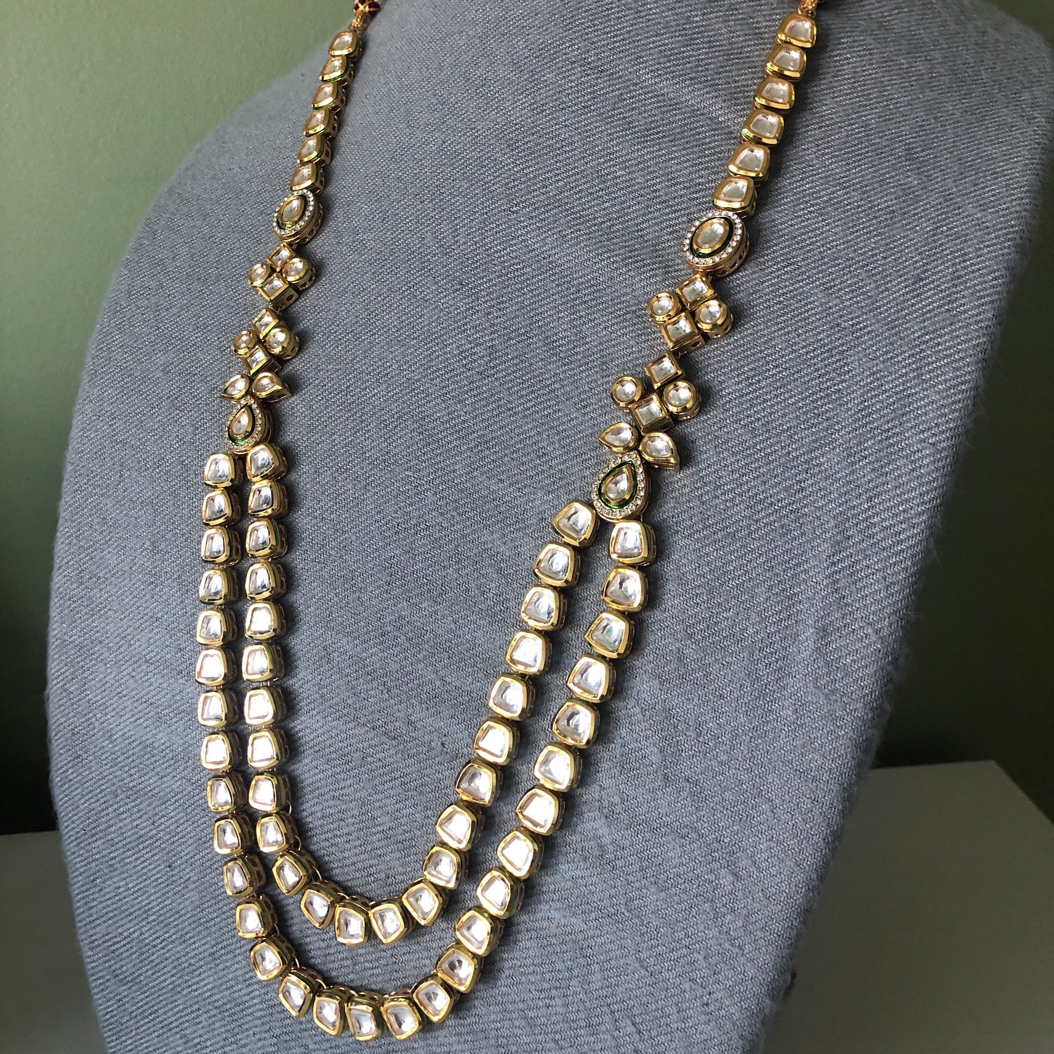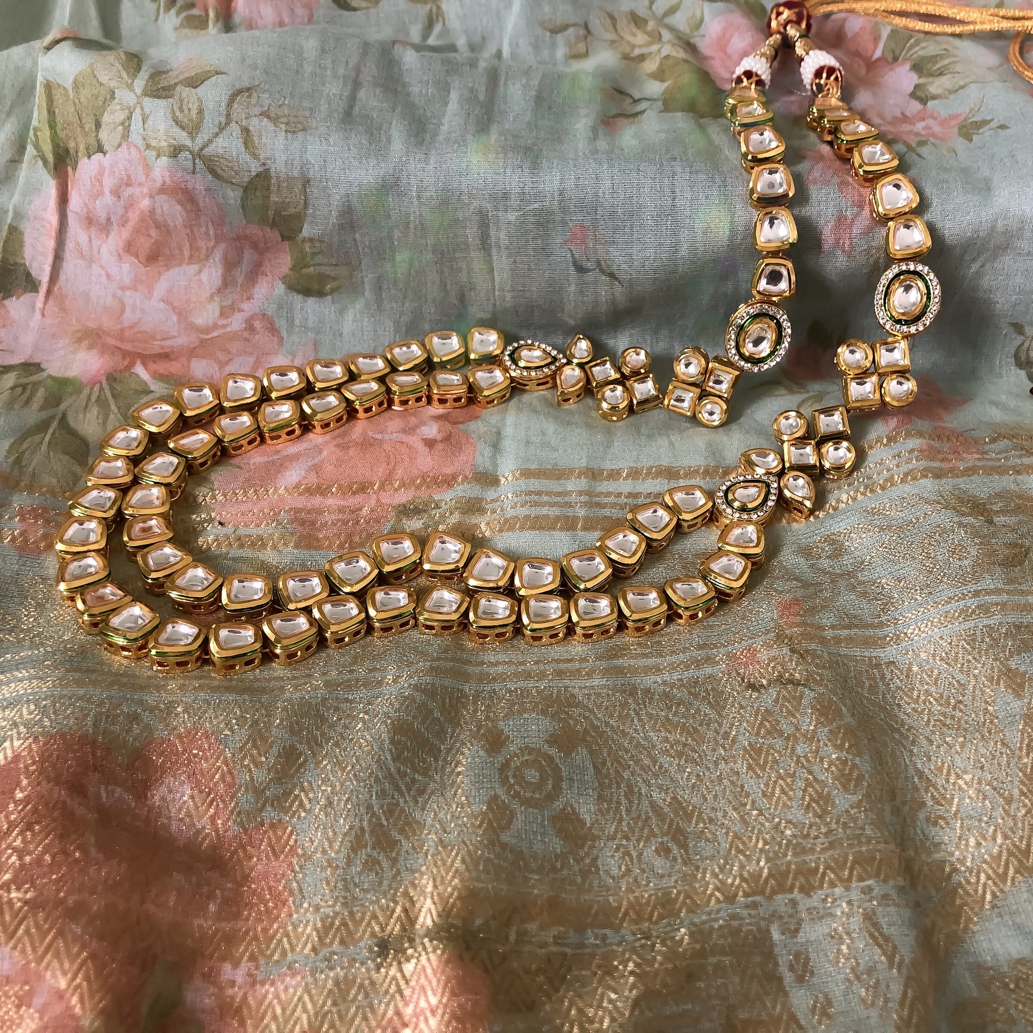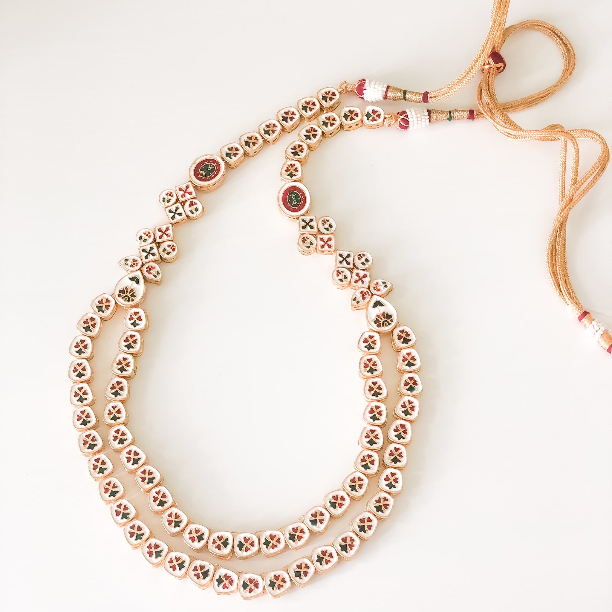 A Kundan maala with exquisite Meenakari at the back. Paired with medium sized drop earrings, this elegant maala will make you look effortlessly beautiful. Comes with matching earrings