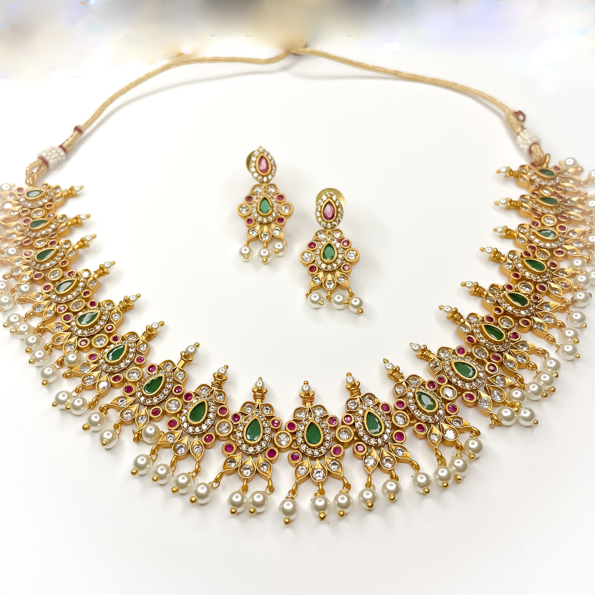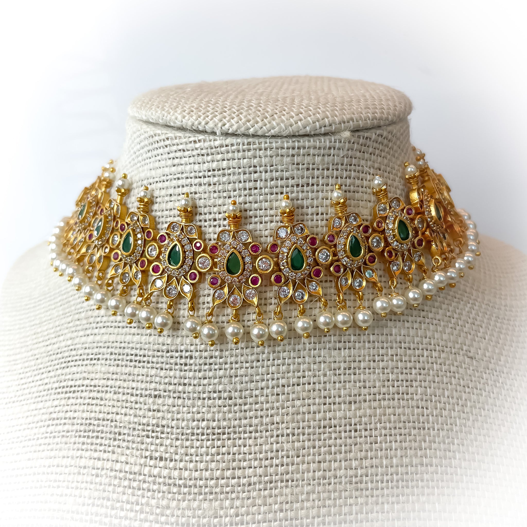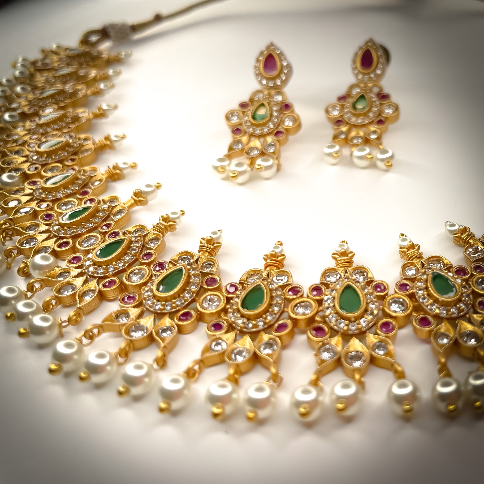 New pearl, Ruby and Emerald choker with matte gold plating. A one of a kind, rare and light weight piece. This one is elegance personified. Wear it up like a choker or lower it to convert into a beautiful necklace!