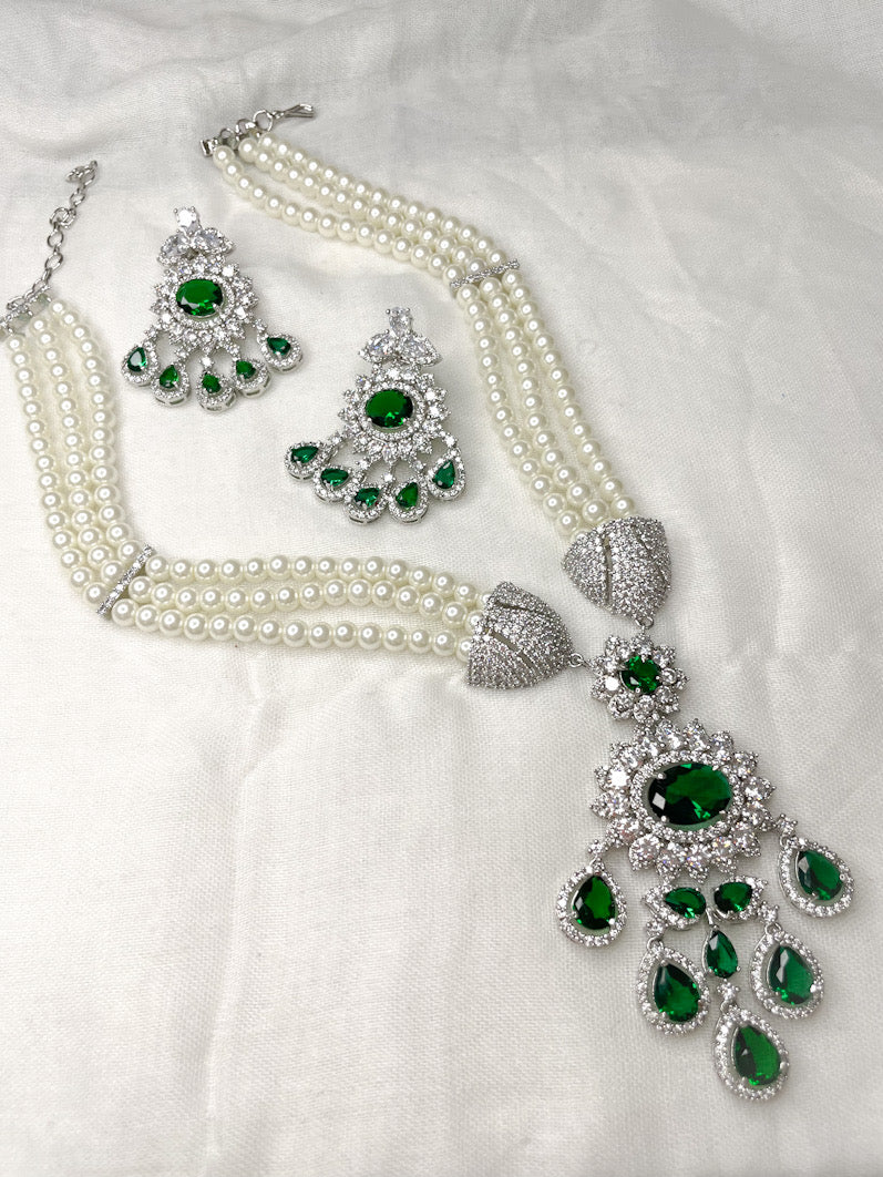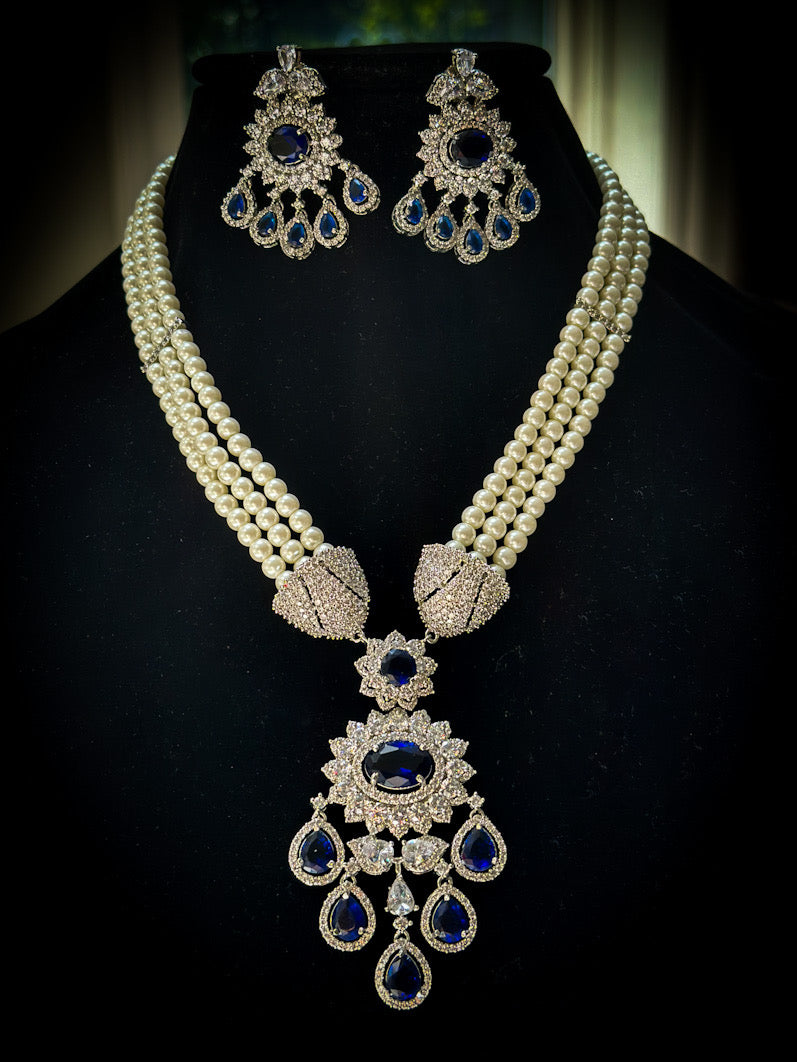 Our American diamond pearl string long necklace. Comes with matching designer earrings