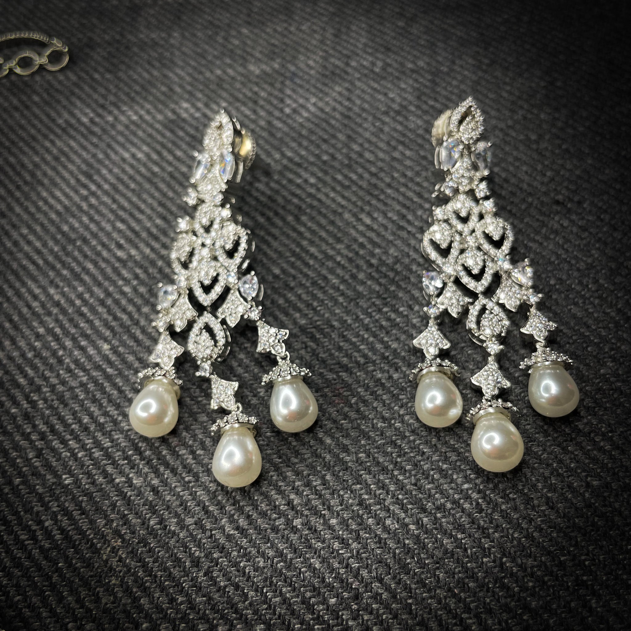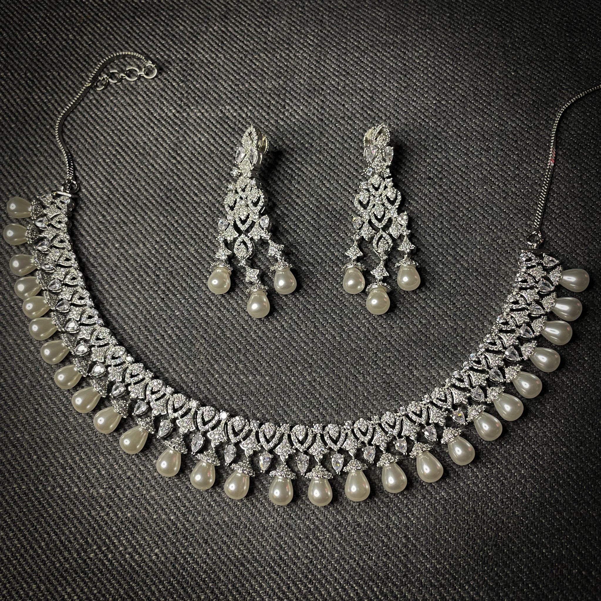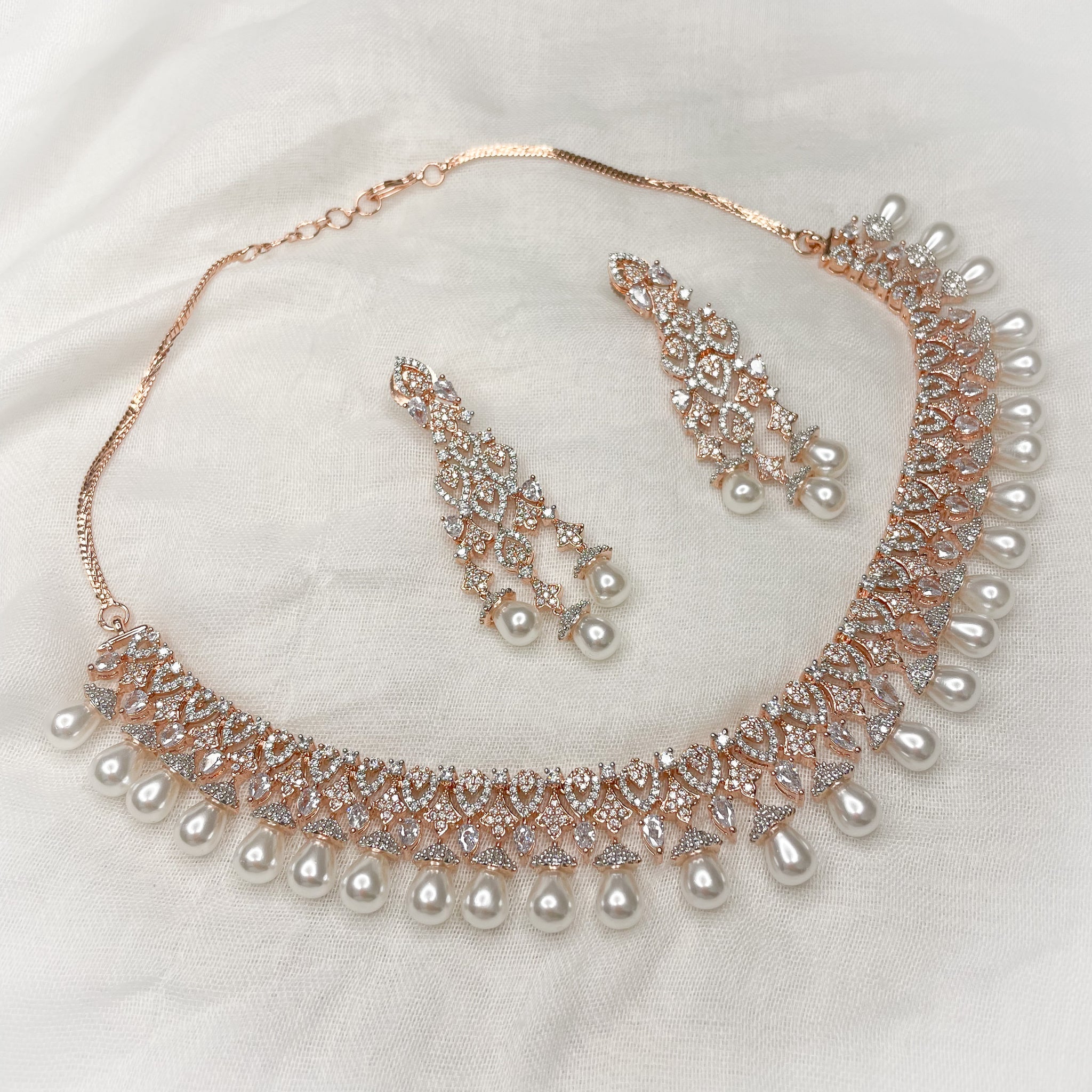 The Emsworth necklace is a beautiful, hand made piece fit for royalty. Wear it down as a necklace, or pull up to convert to a choker. Intricately set with American diamonds and bordered with faux pearls, this is one to be treasured for many years to come!