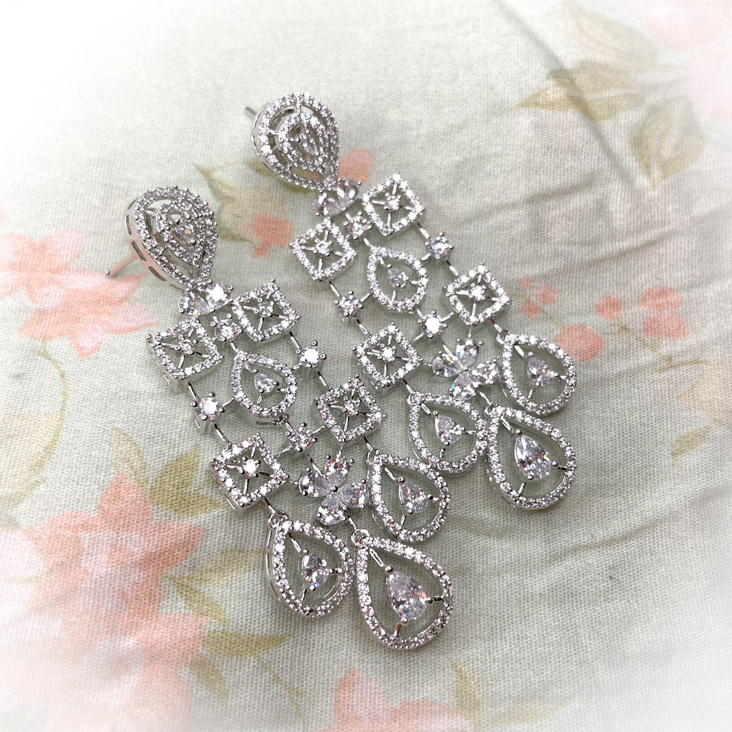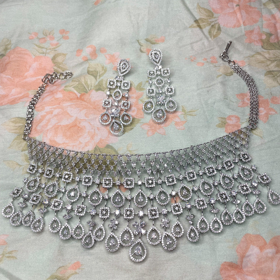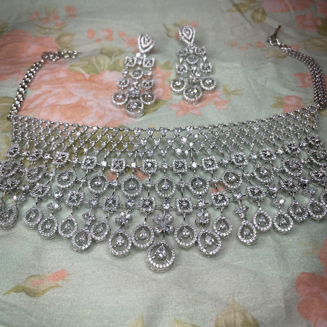Our opulent and indulgent, yet light weight and fluid piece crafted with American diamonds on rhodium polish. This one is a kind meshed necklace is truely a work if art! Comes with matching earrings