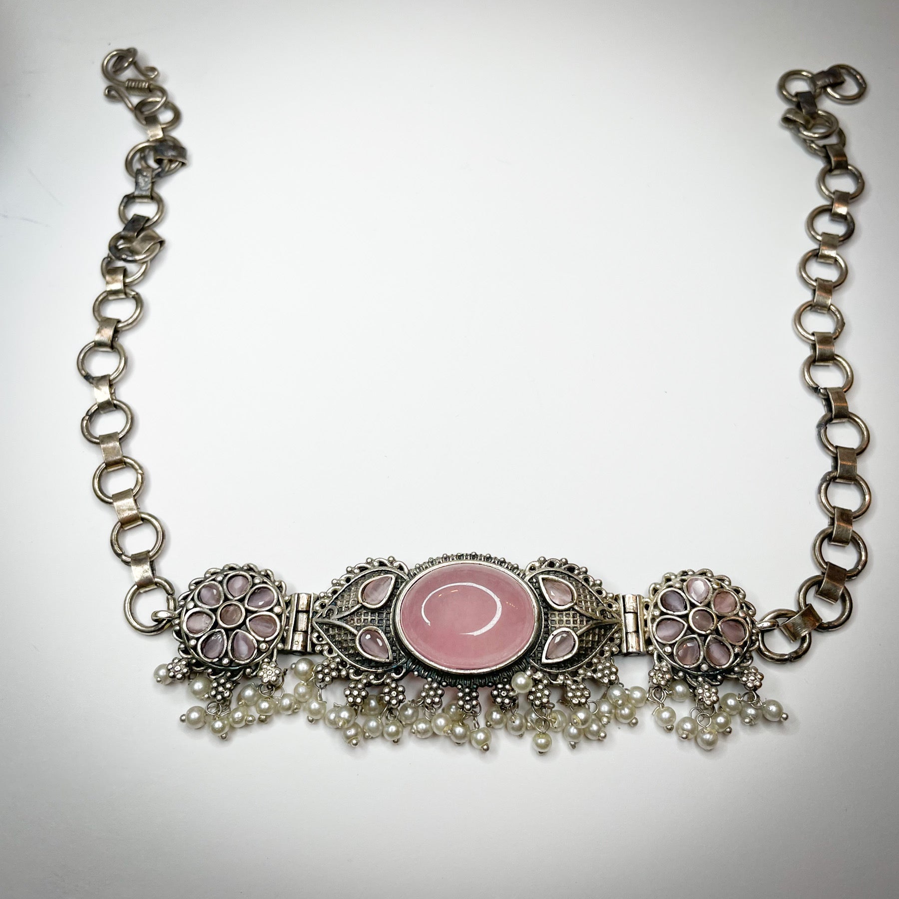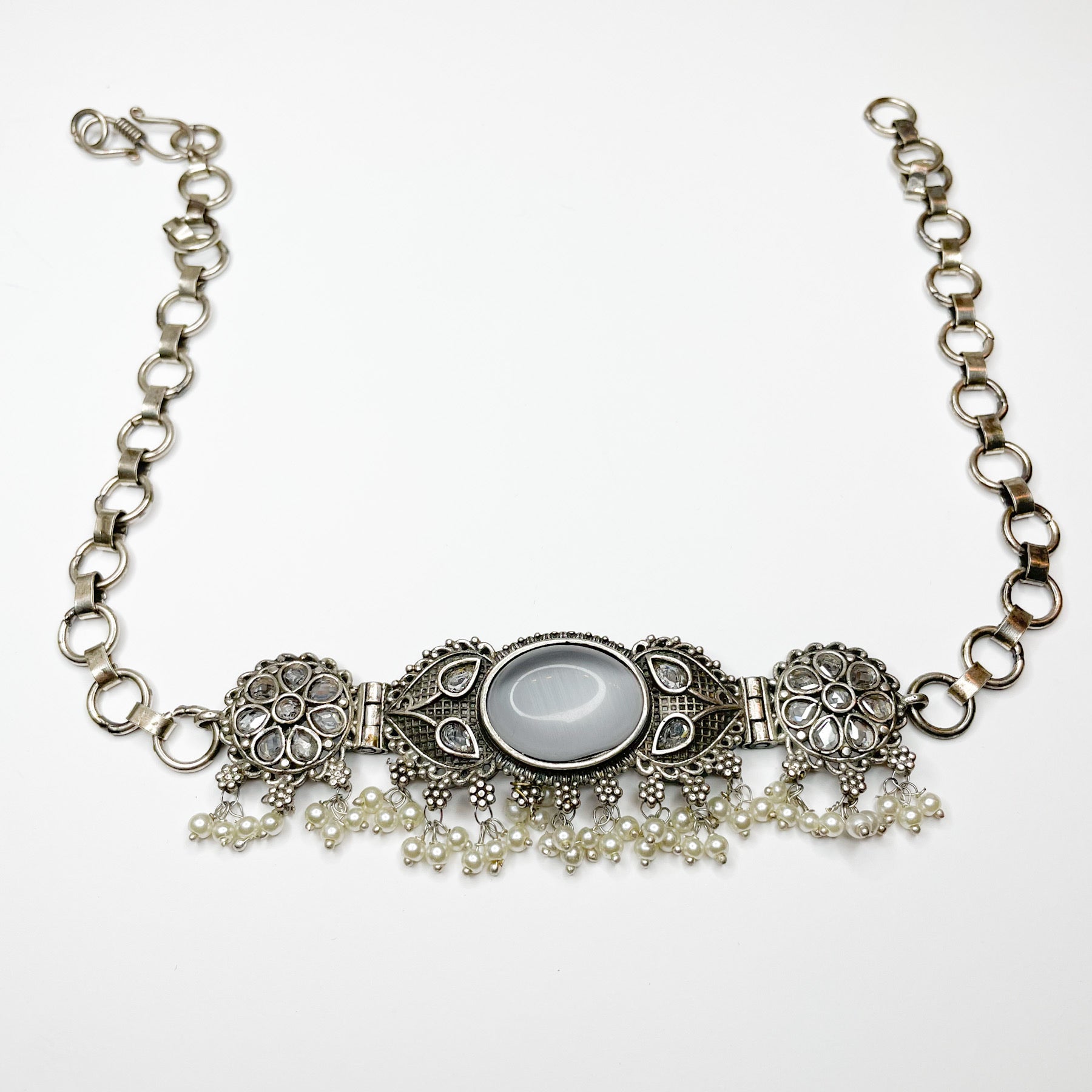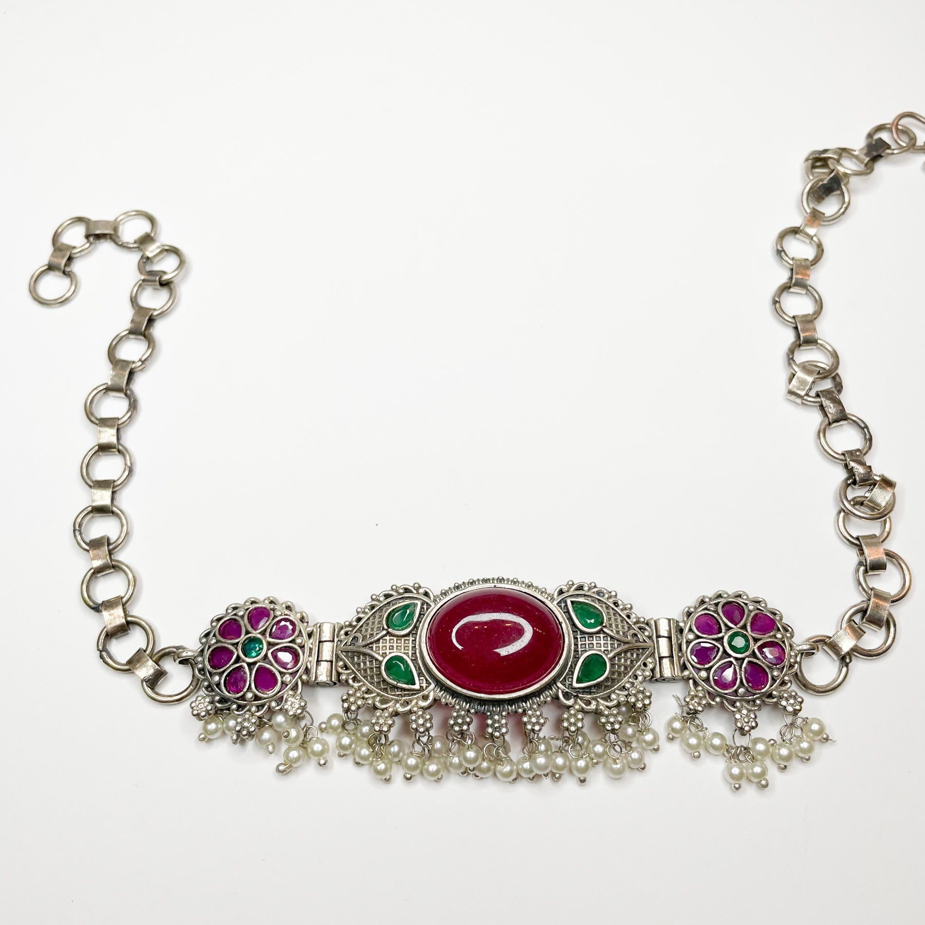 German silver delicate chokers, hand carved and set with semi precious stones.