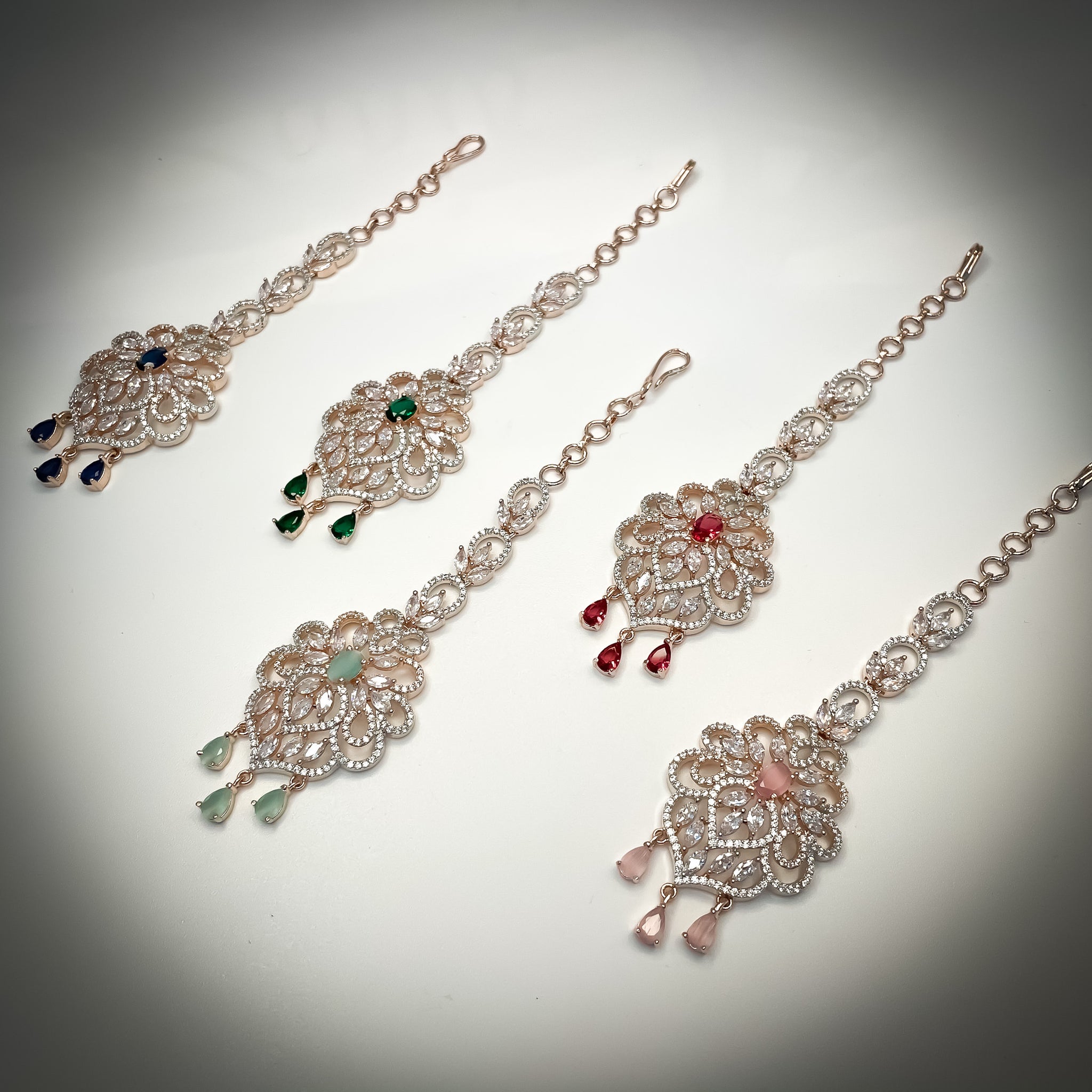 Our Rose gold plated, diamond design tikka available in a variety if colors.