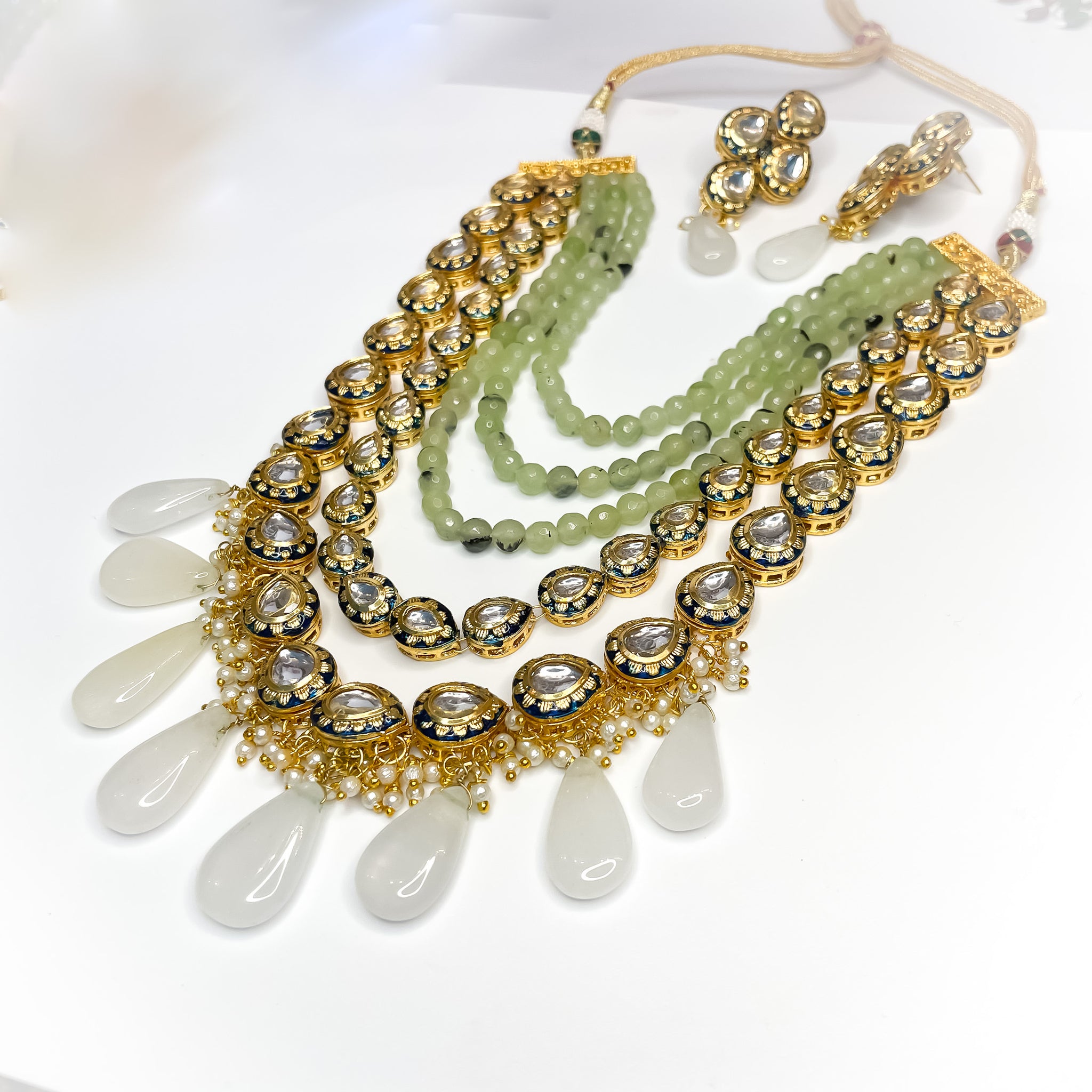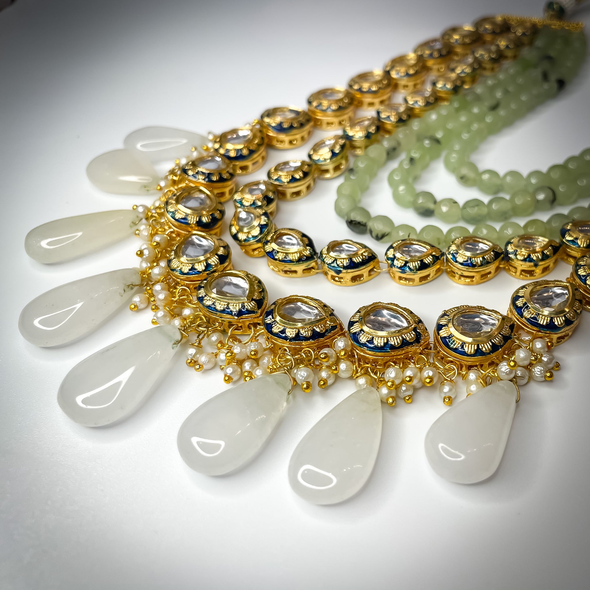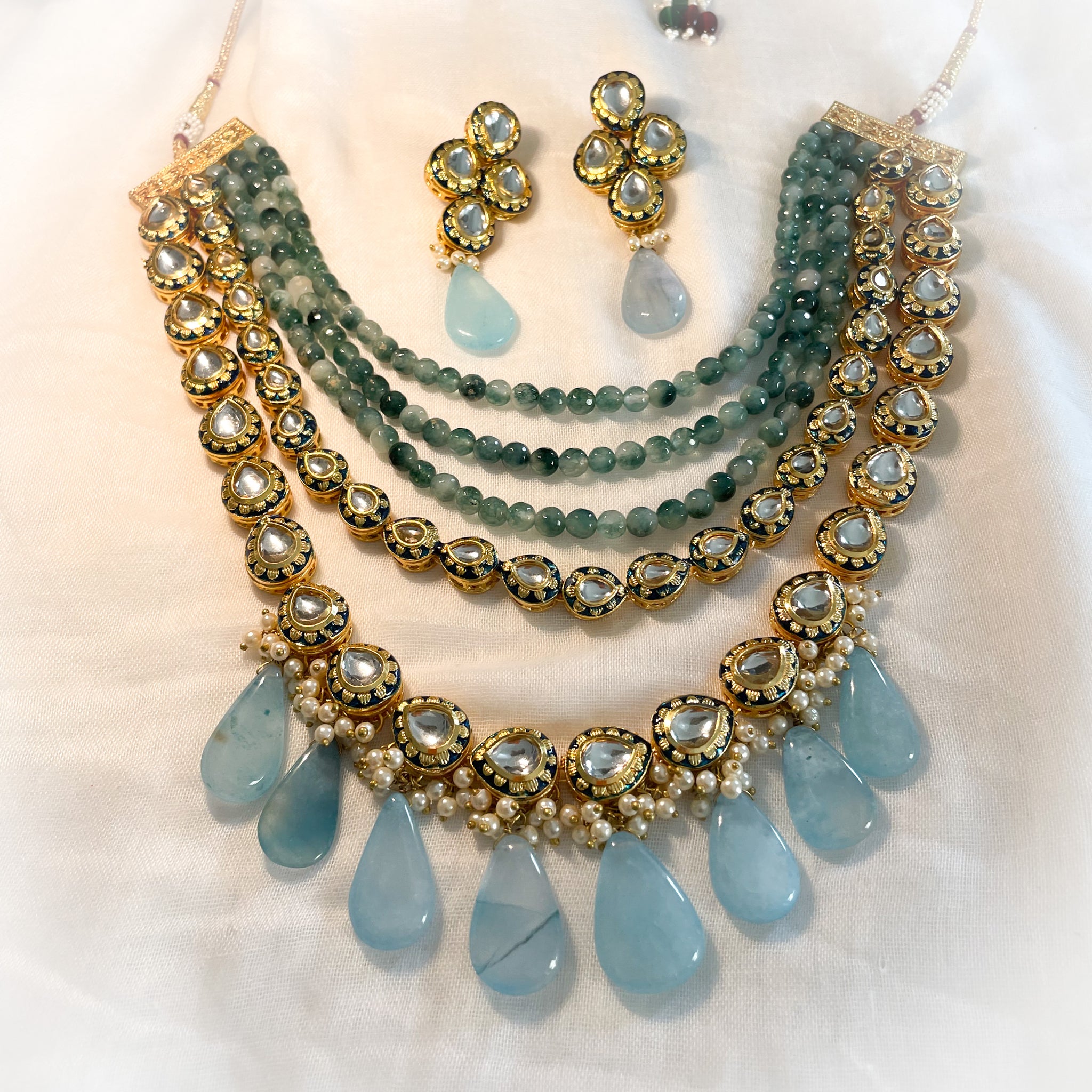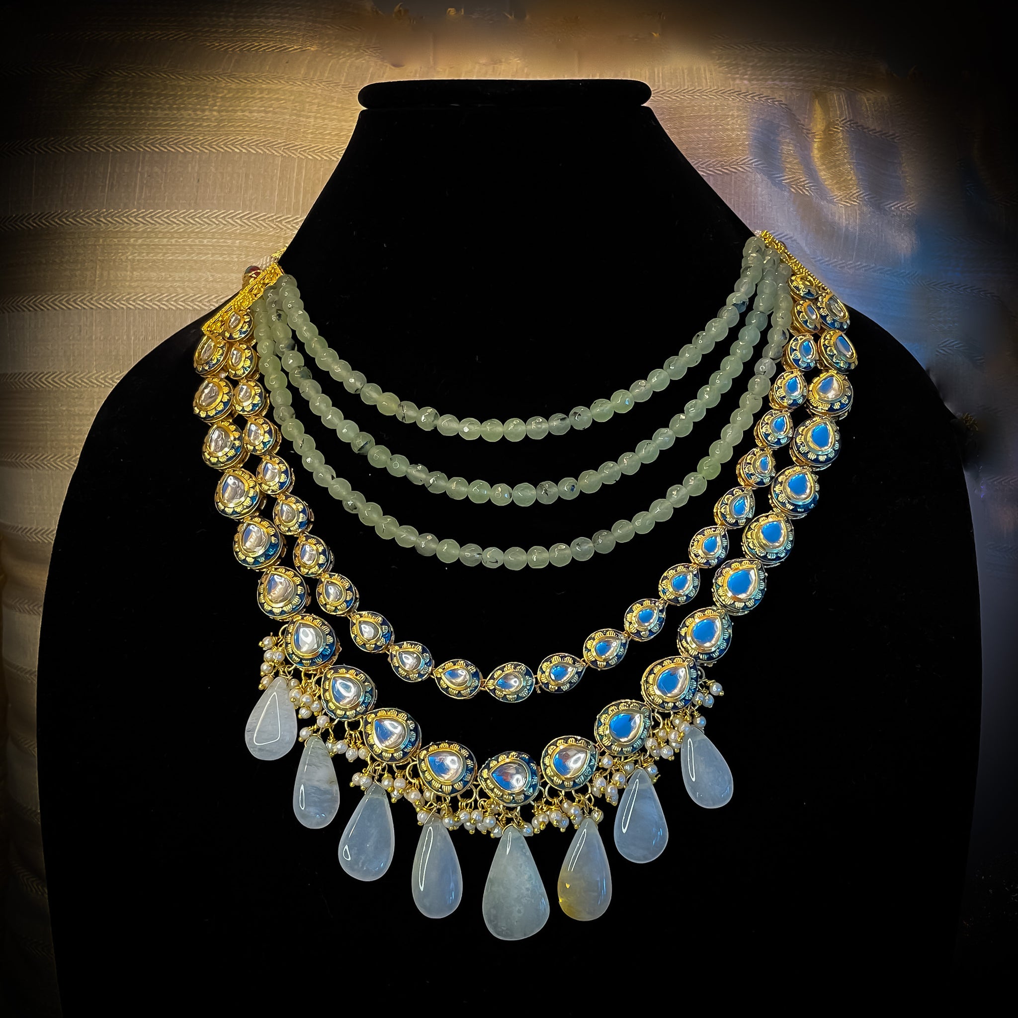 Our five layered long necklace with a gorgeous array of textures. Semi precious stones and Kundan elements embellished with gold Meena come together to form this riveting piece.