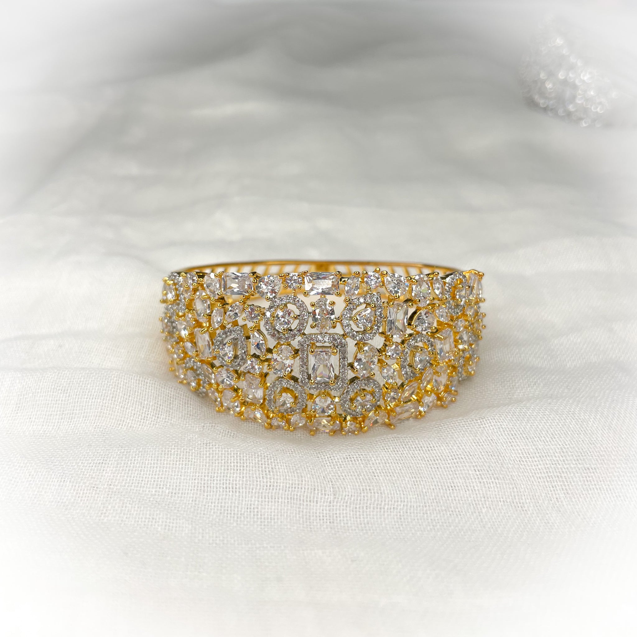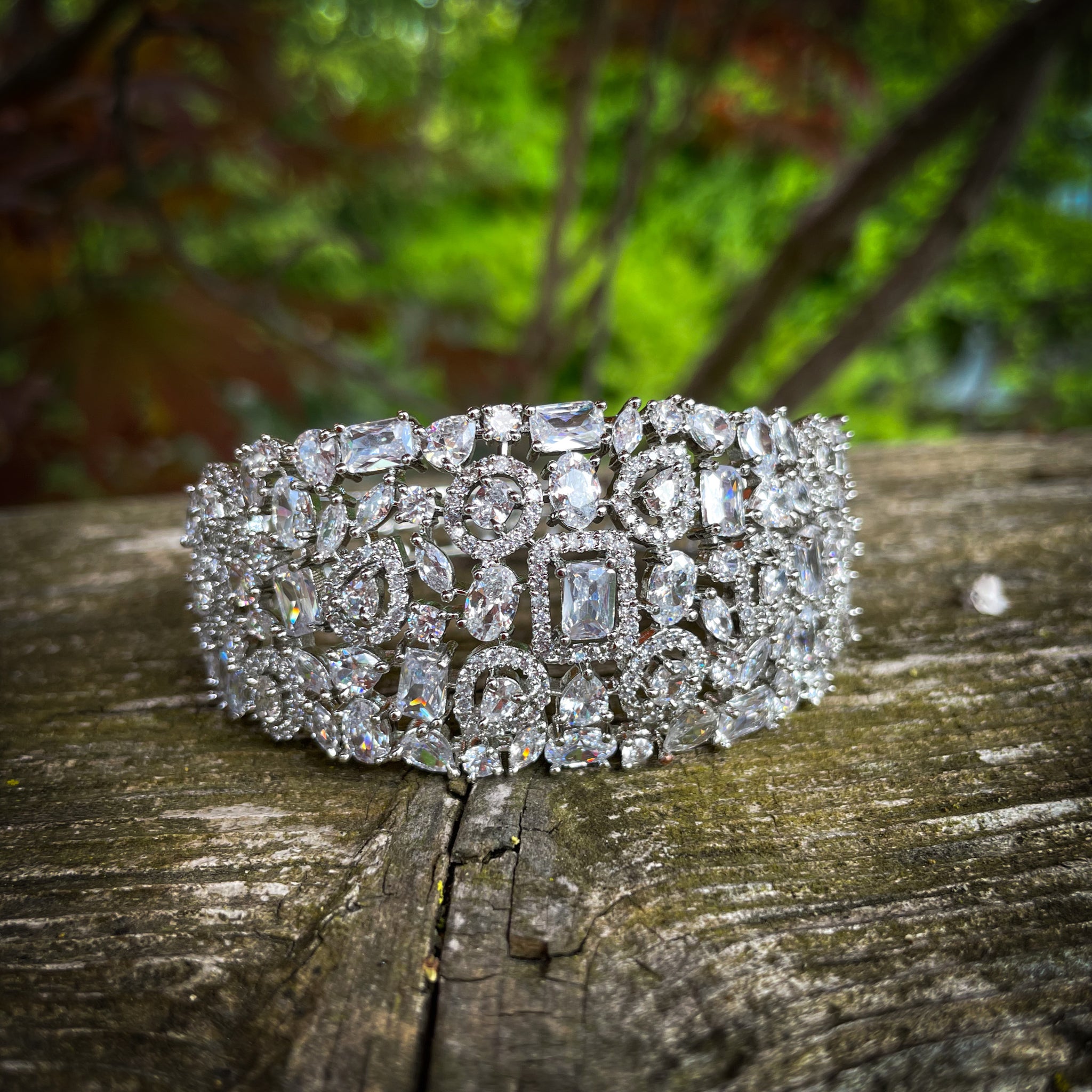 Wide, openable bracelets elaborately worked with stones of different shapes and sizes. A true specimen of master workmanship