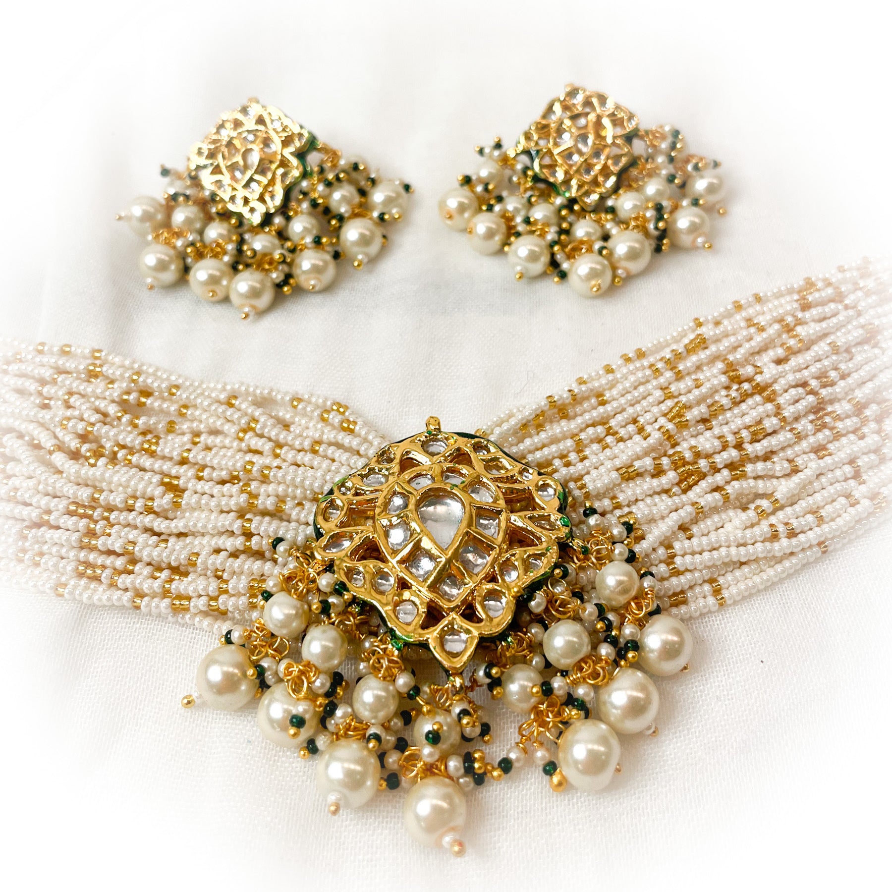 Kundan choker with gold and white pearl strings. Comes with matching studs