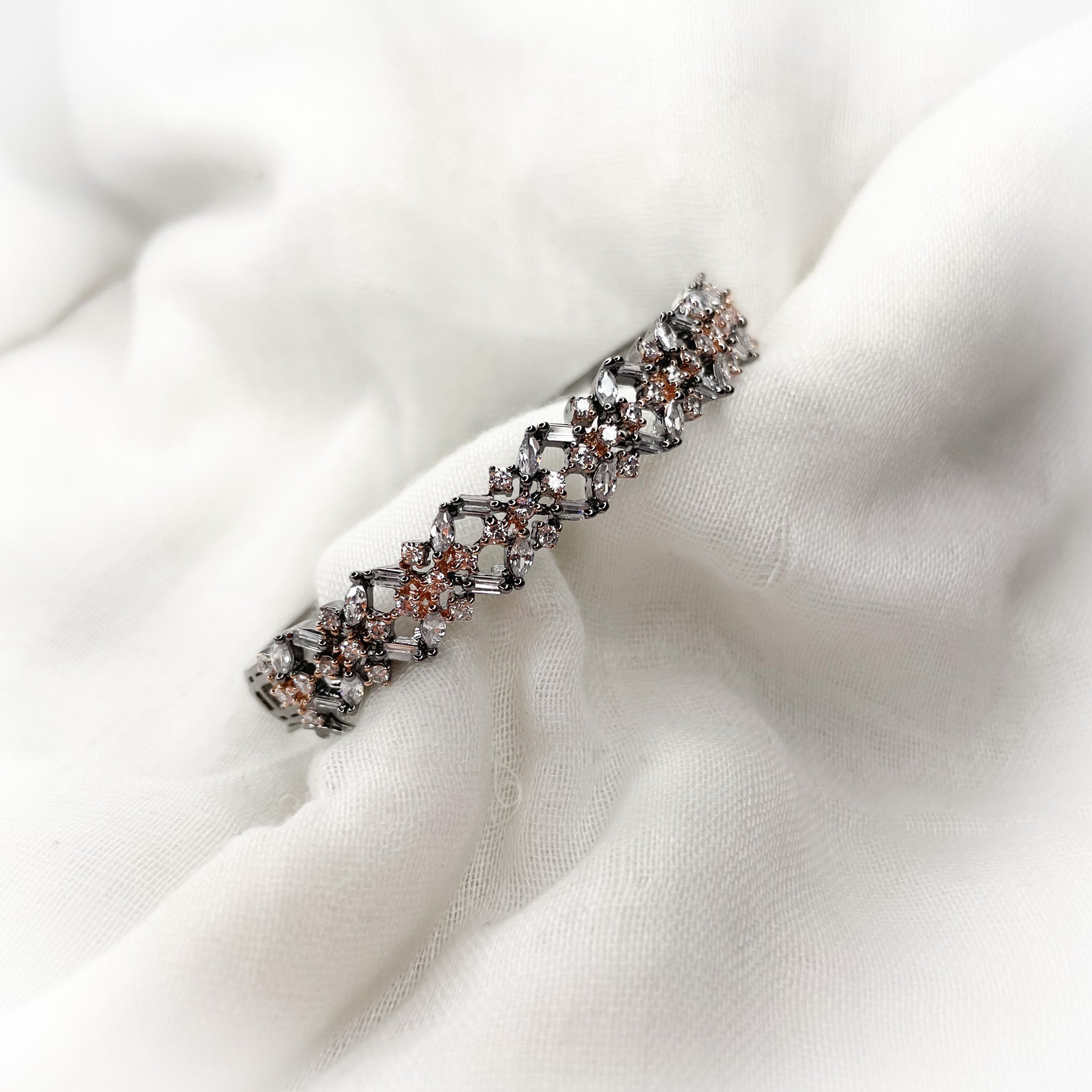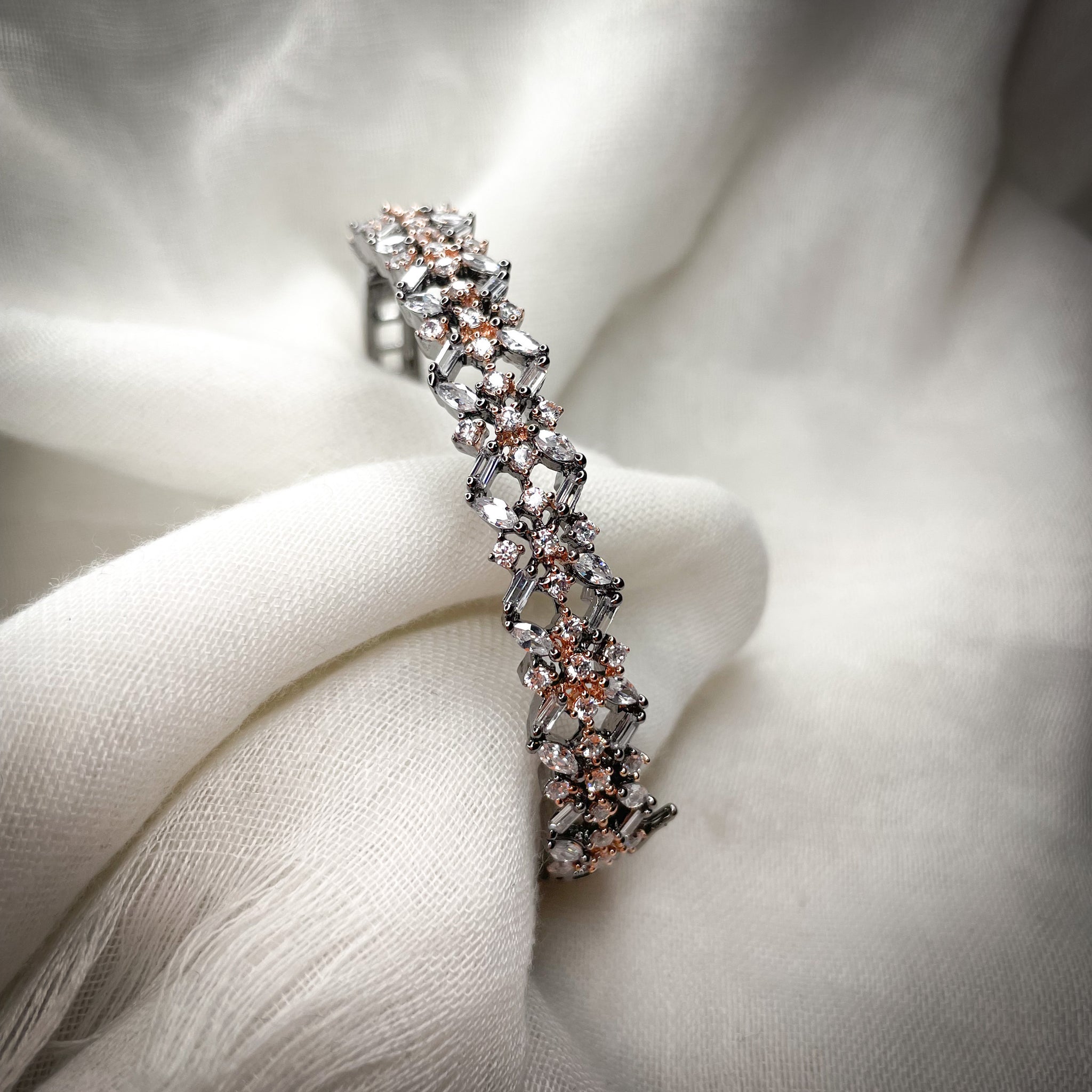 Gun metal and rose gold plated bracelet featuring American diamonds in standard and baguette settings