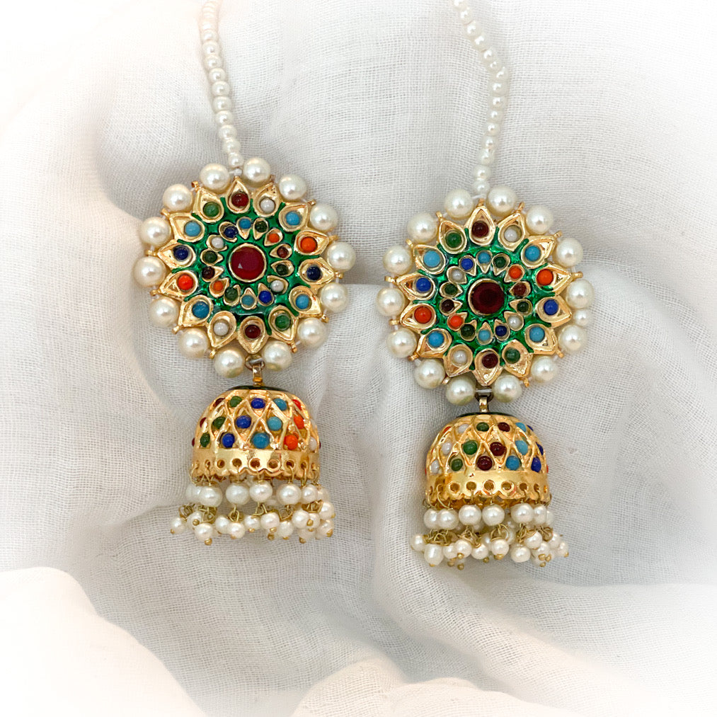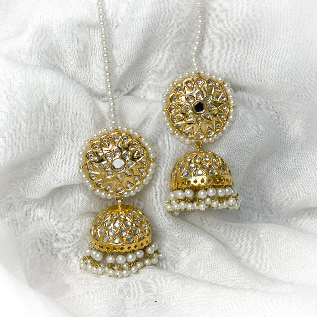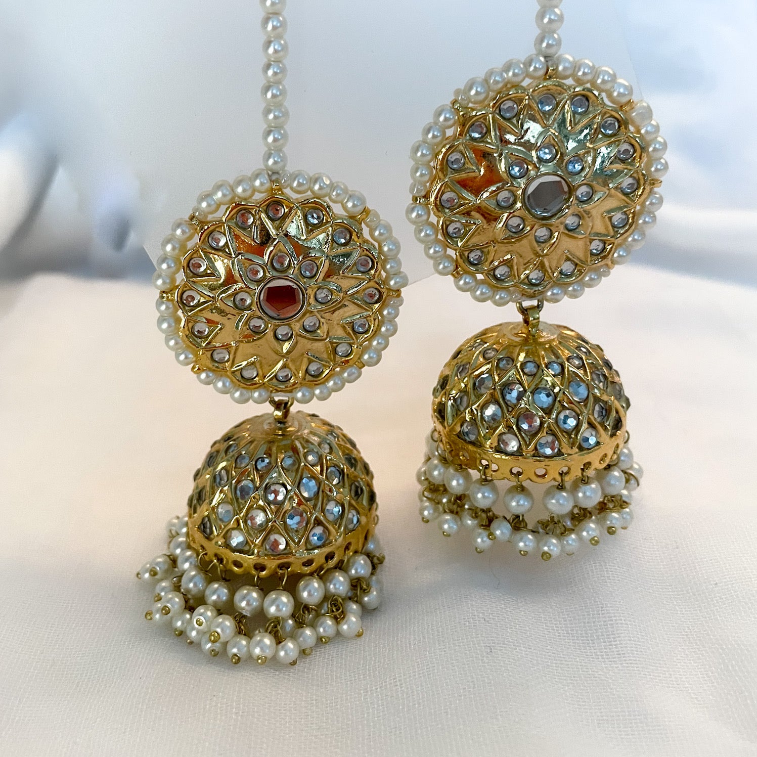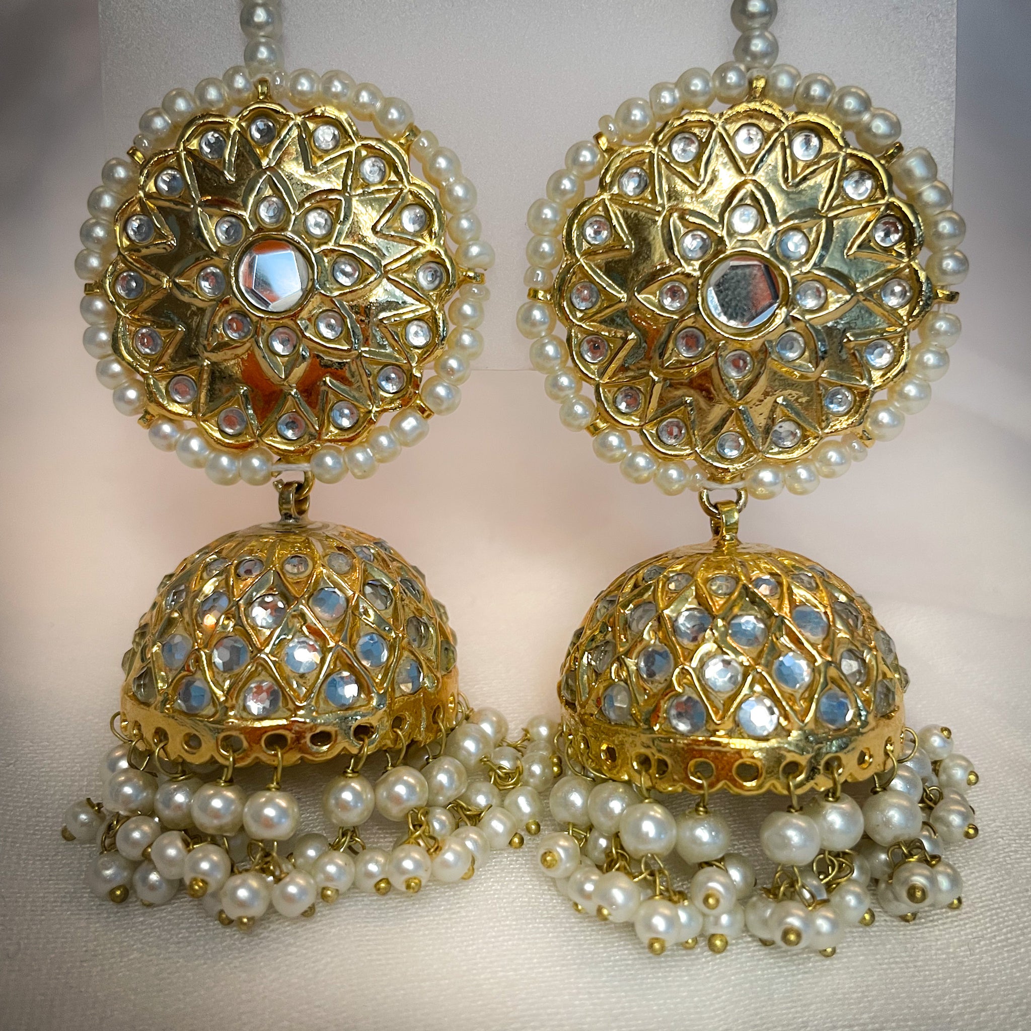 Thappa kundan, medium sized jhumkas. Light weight and gold plated with pearl saharas these will become your go to for all festive occasions