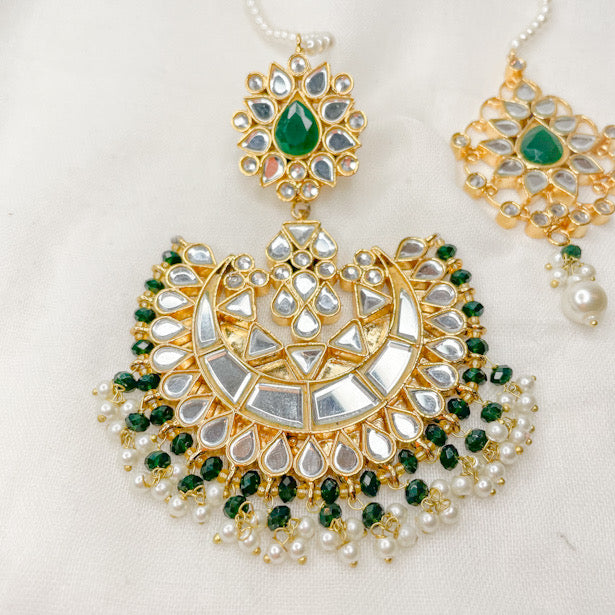 Oversized Farshi Kundan chand balis paired with a matching tikka