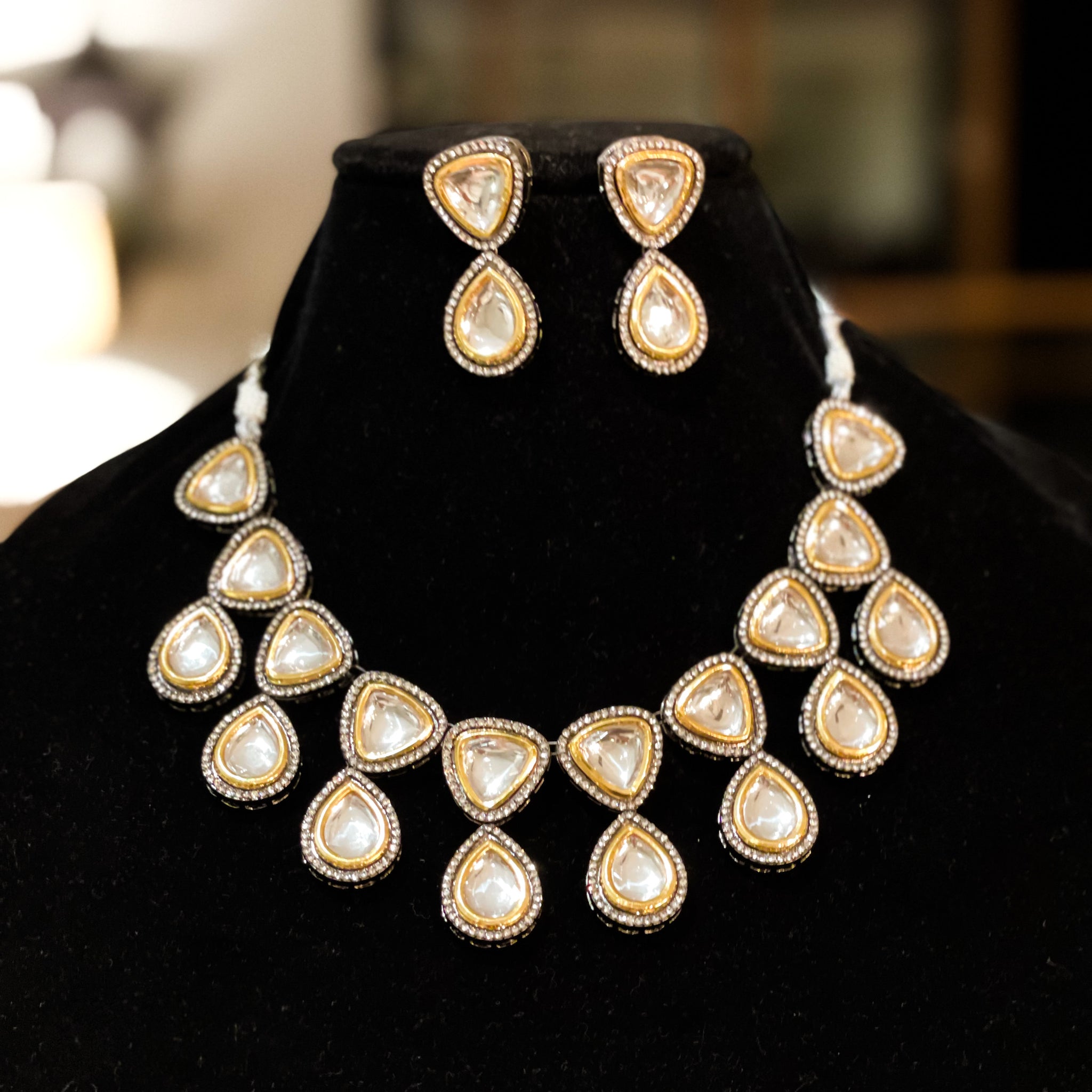 One of our favorite pieces on the website, this rhodium plated set features fluid kundan droplets surrounded by zicons. Comes with matching gorgeous earrings